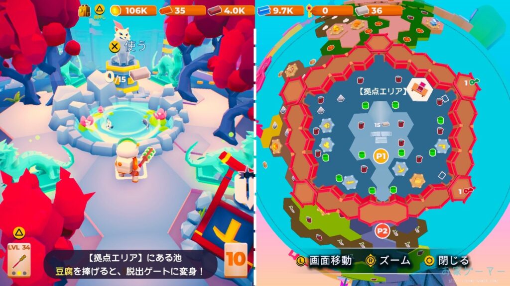 キーアイテム「白い鯉」と「黒い鯉」を入れた池のそばにいる 神々しい白オオカミに【豆腐】を 15個プレゼントすると、【脱出ゲート】が出現する。