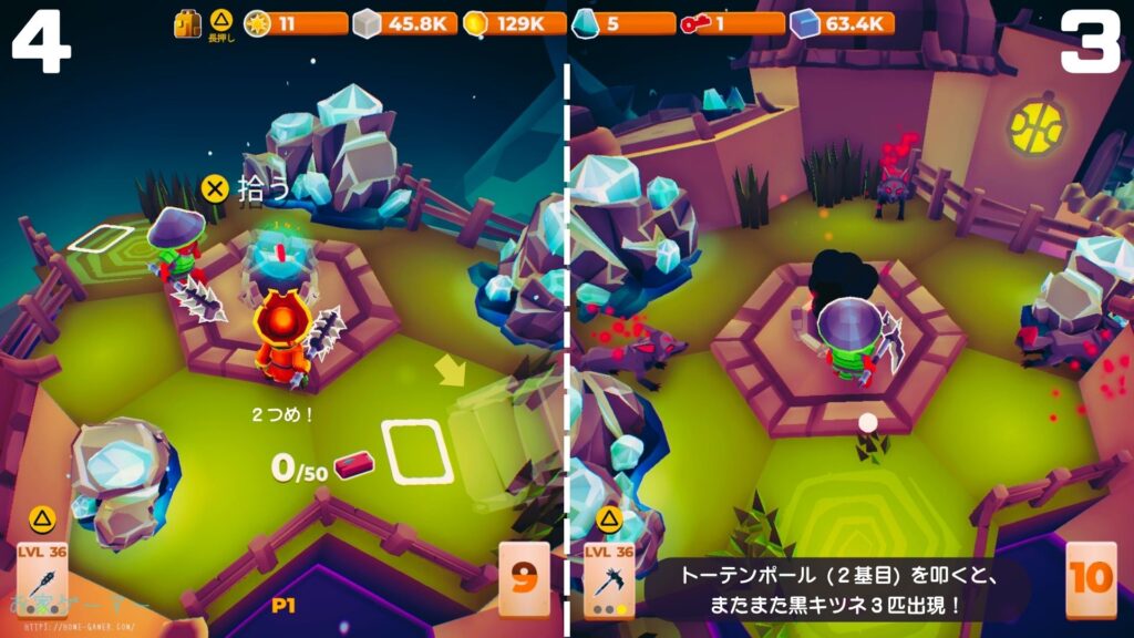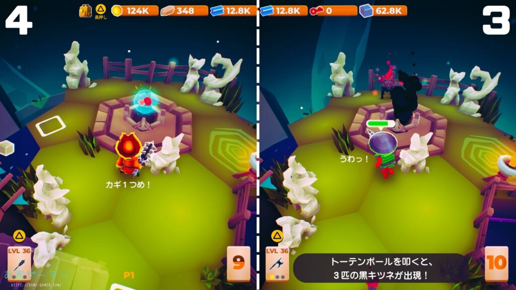 3. トーテンポールを叩くと、3匹の黒キツネが出現
