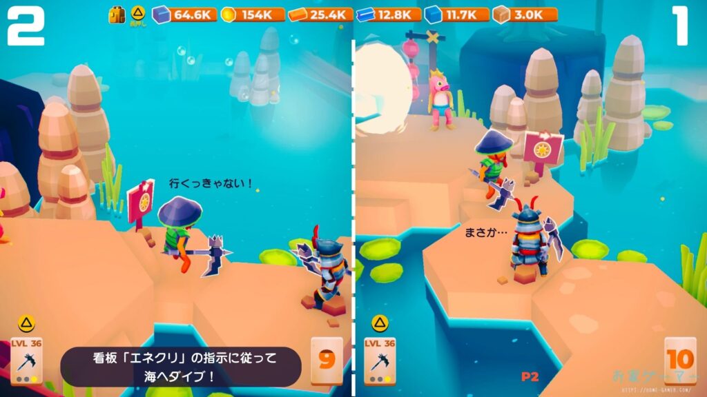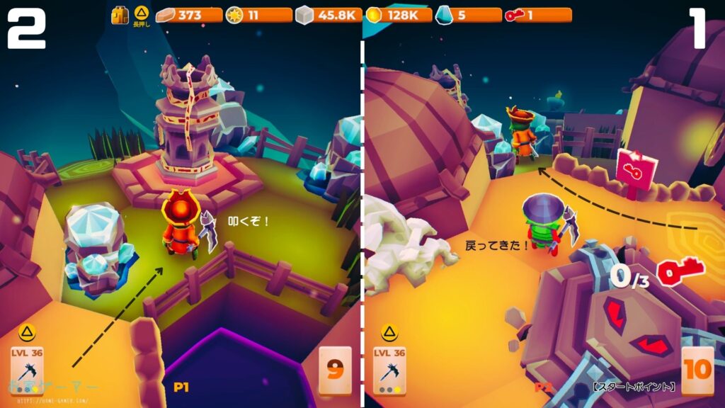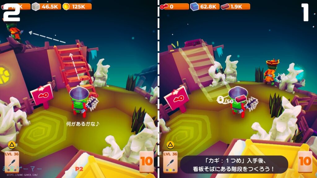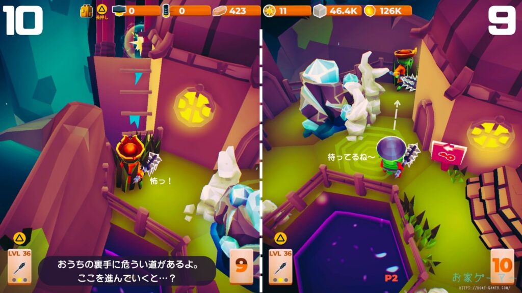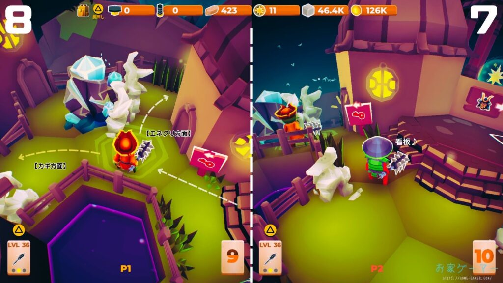 9.【 2人プレイ時 】1人は 看板「カギ (赤)」のとなりで 待っていよう