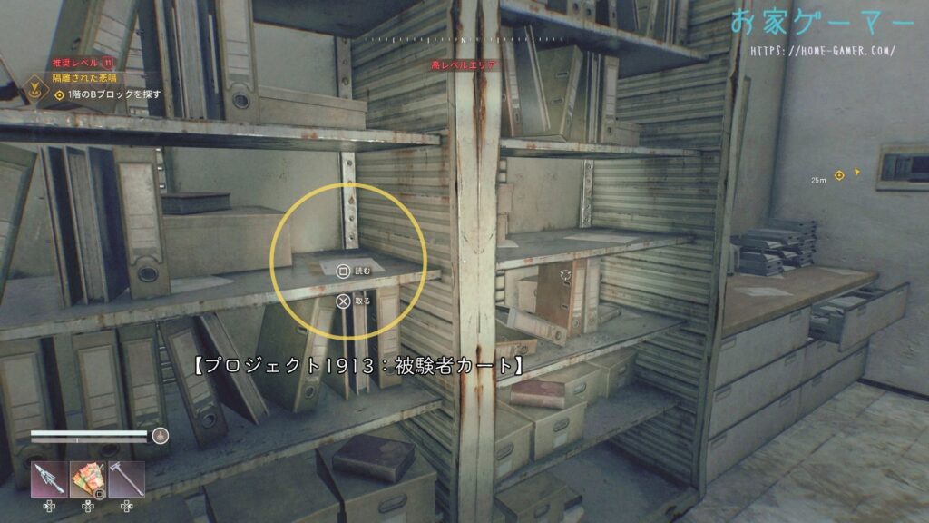 職員用カードキー」入手後、目標が “ Bブロックで薬品保管庫を探す ” に変更される。