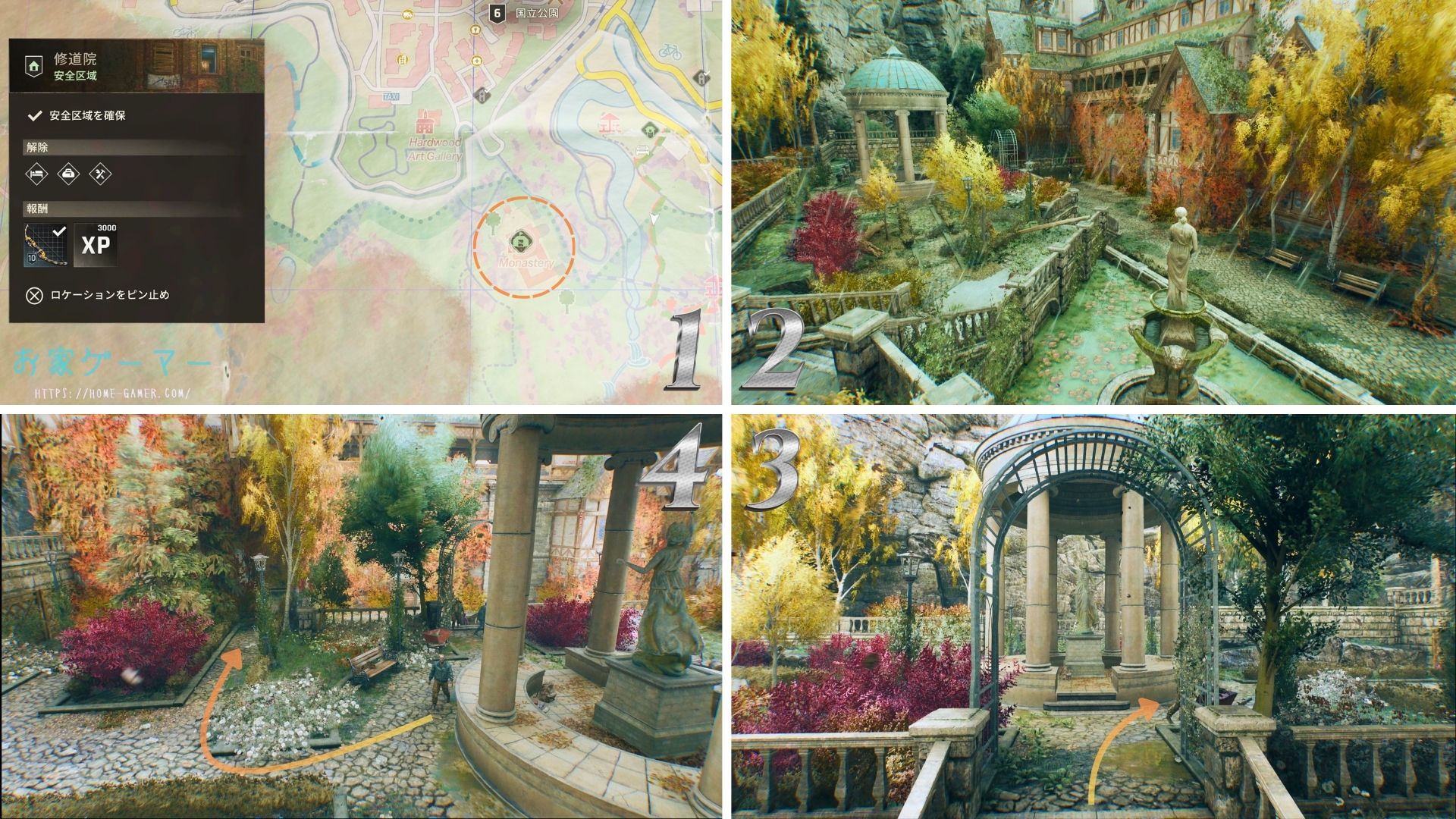 そうです!メインクエスト「避難場所」 攻略中に 1番最初に訪れる 修道院の中庭です。